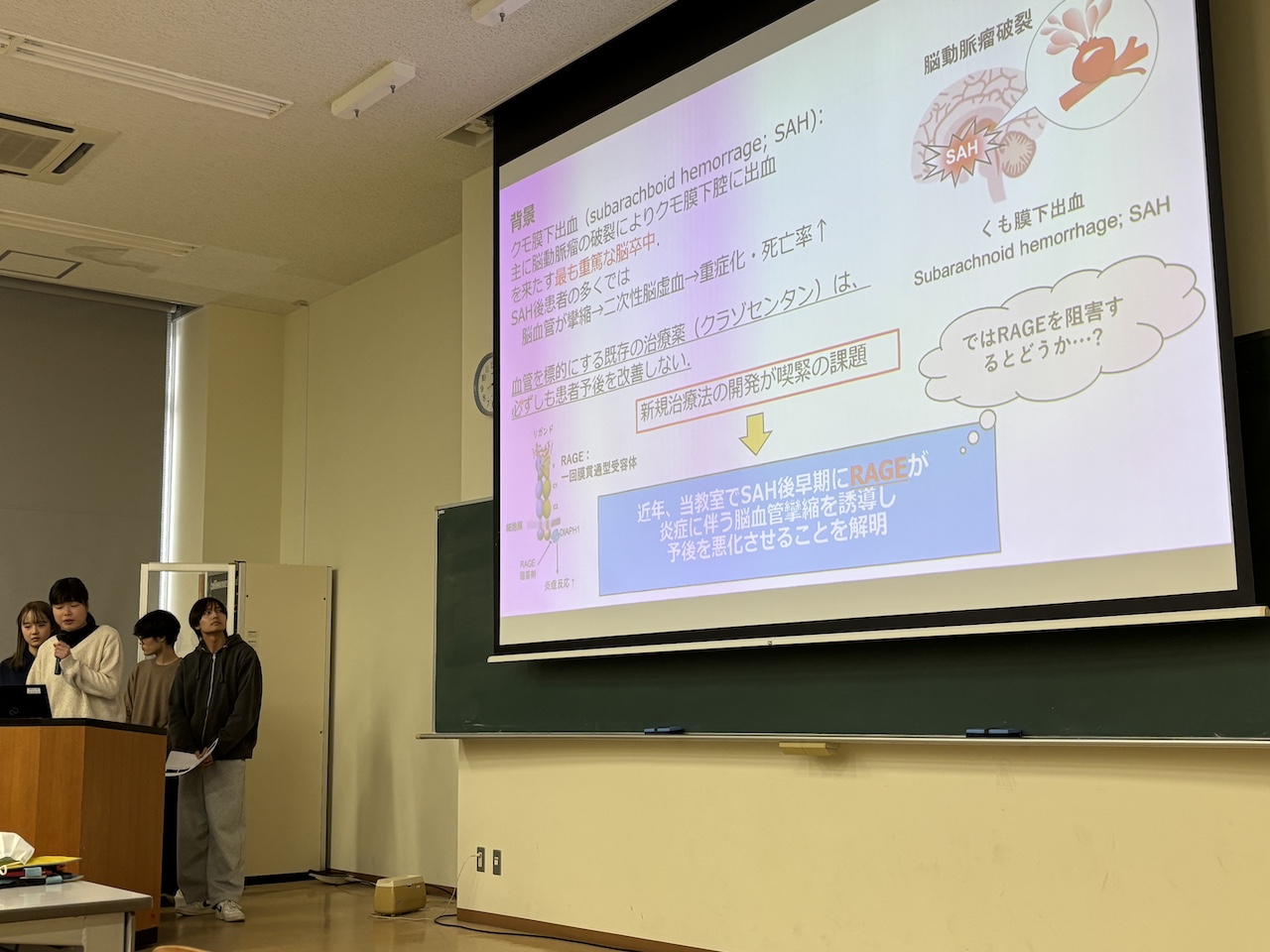 基礎配属で教室に加わってくれていた、医学類3年生の松本君、坂賀さん、瀬尾君、岩崎君、大熊君、吉村君の6名が11月27日に発表をしました。5分間という短い時間でしたが、大変良いプレゼンでした。